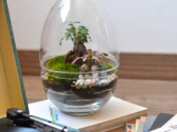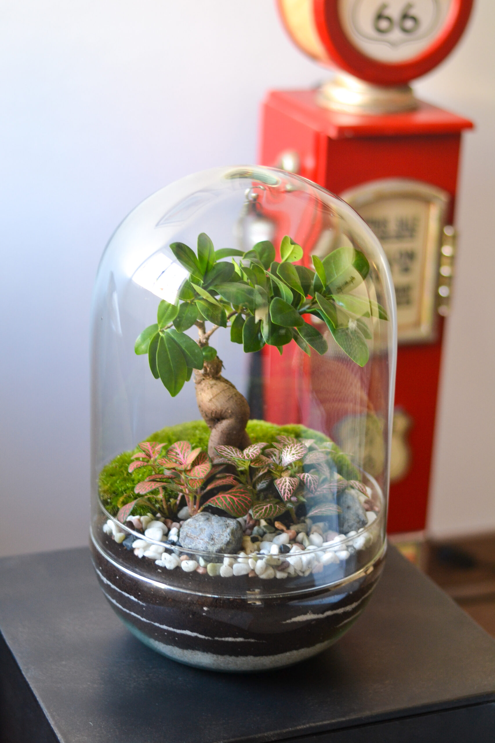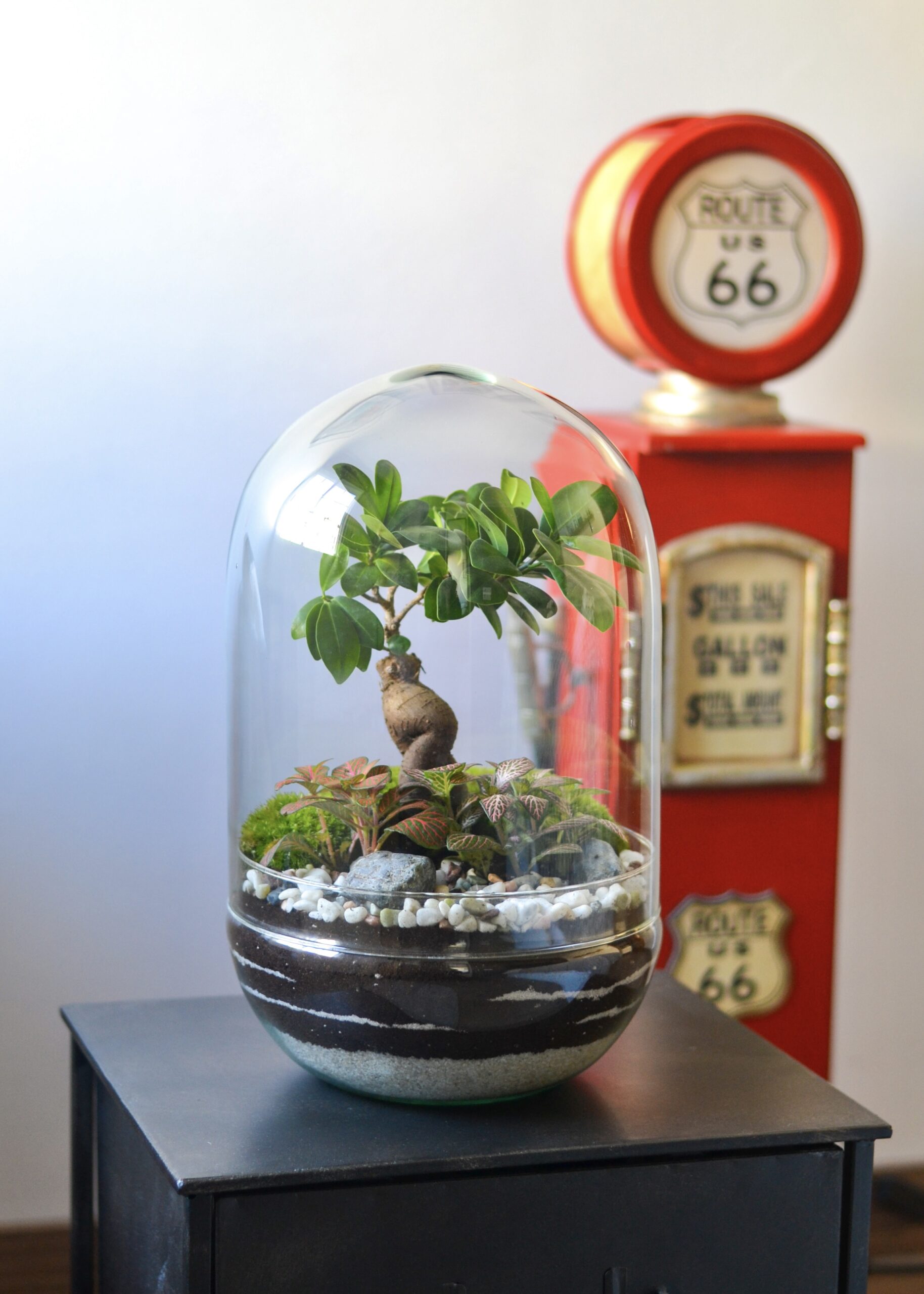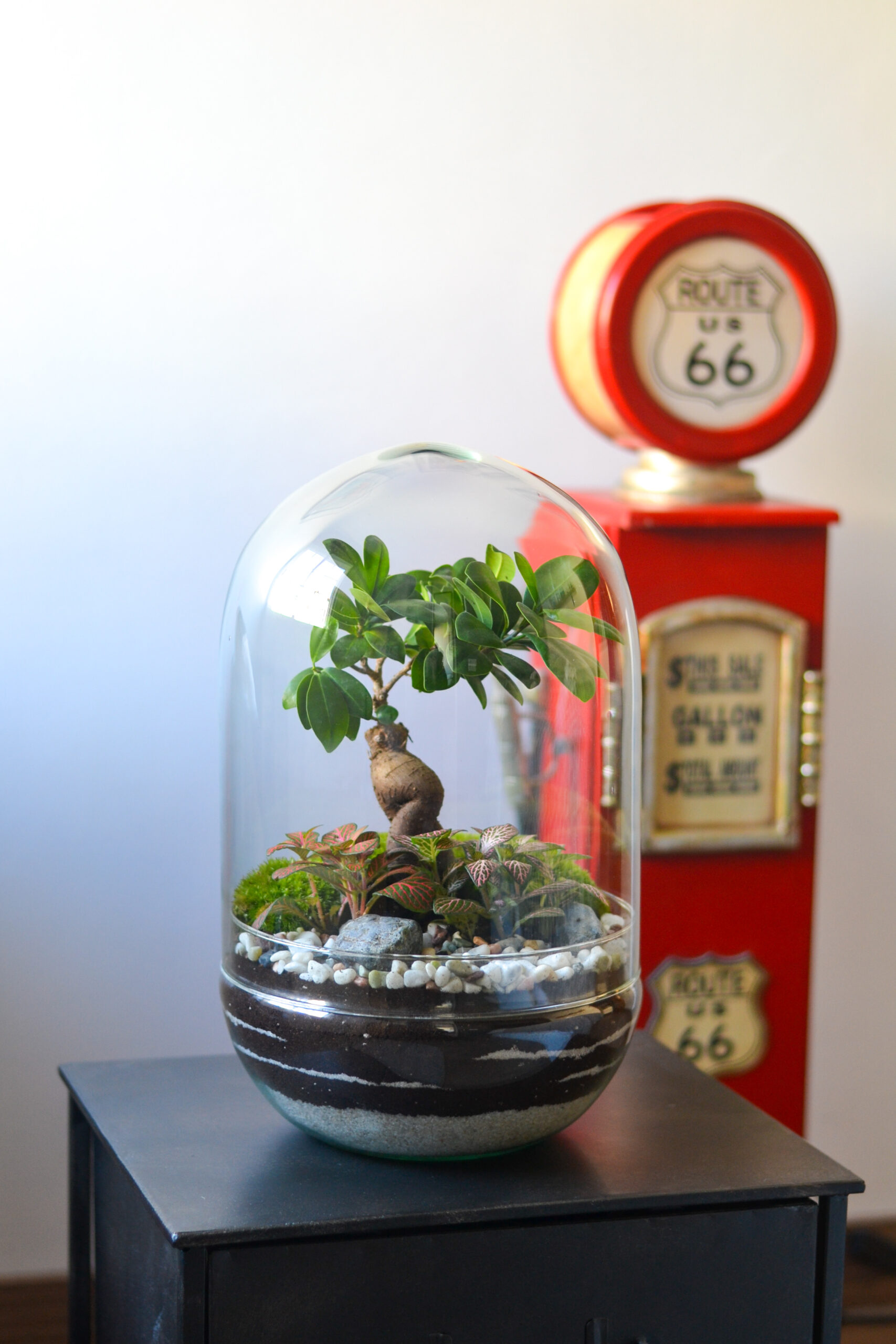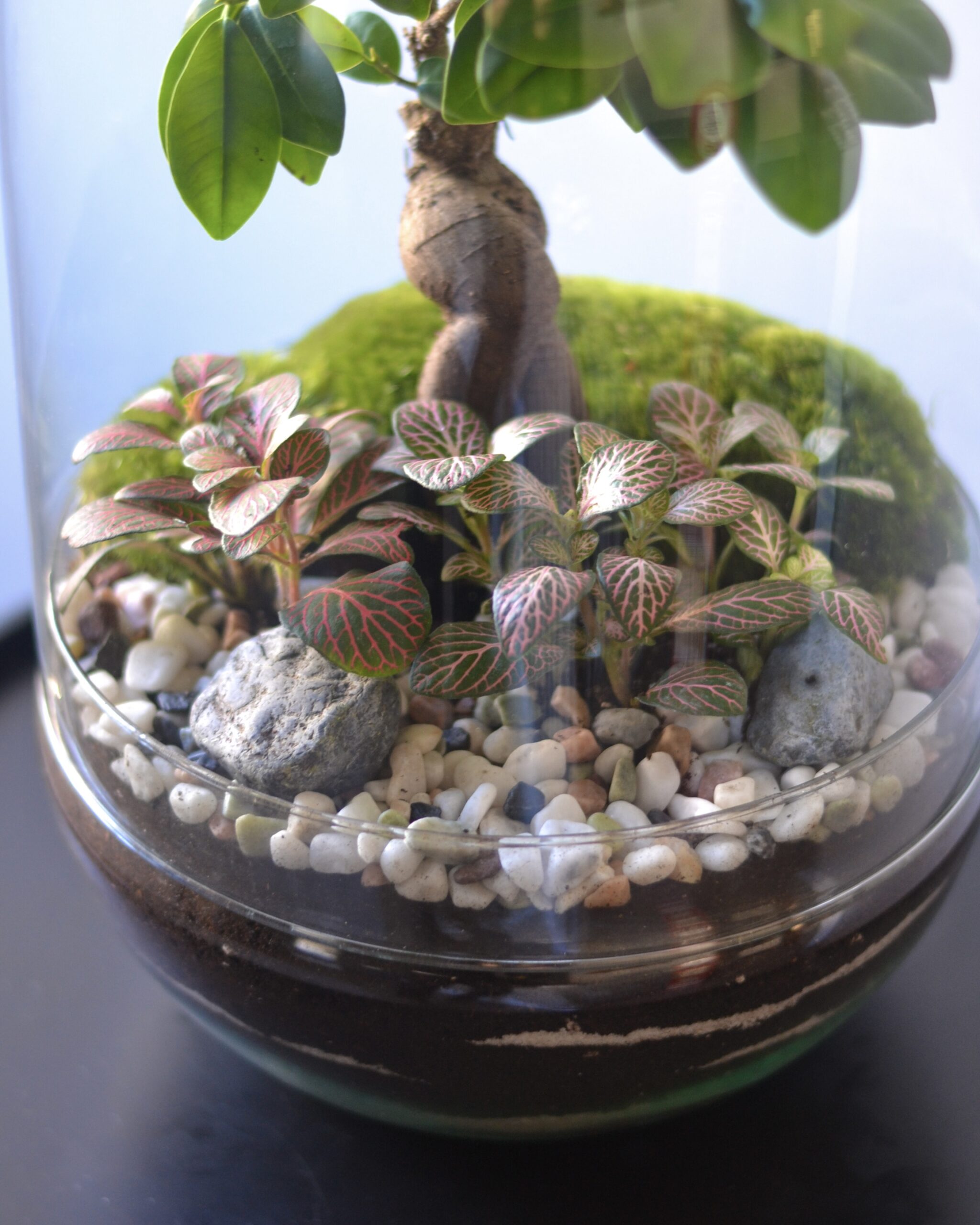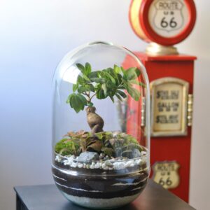 El jardín eterno  modelo A Toxa Maxi está formado por una bonita composición que puede contar con un ficus ginseng acompañado de fitonias y musgo bola con grava decorativa. Este modelo dispone de tapa de vidrio.
