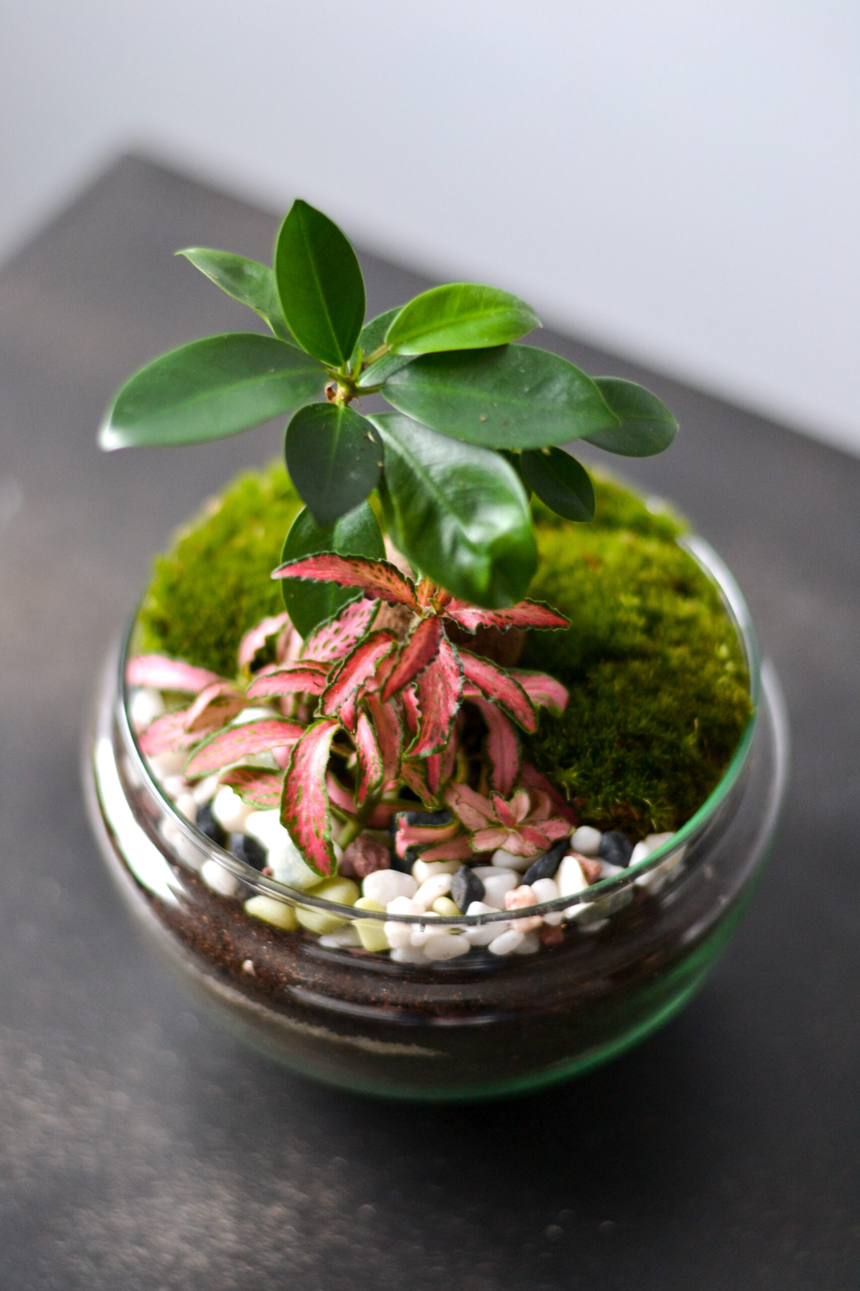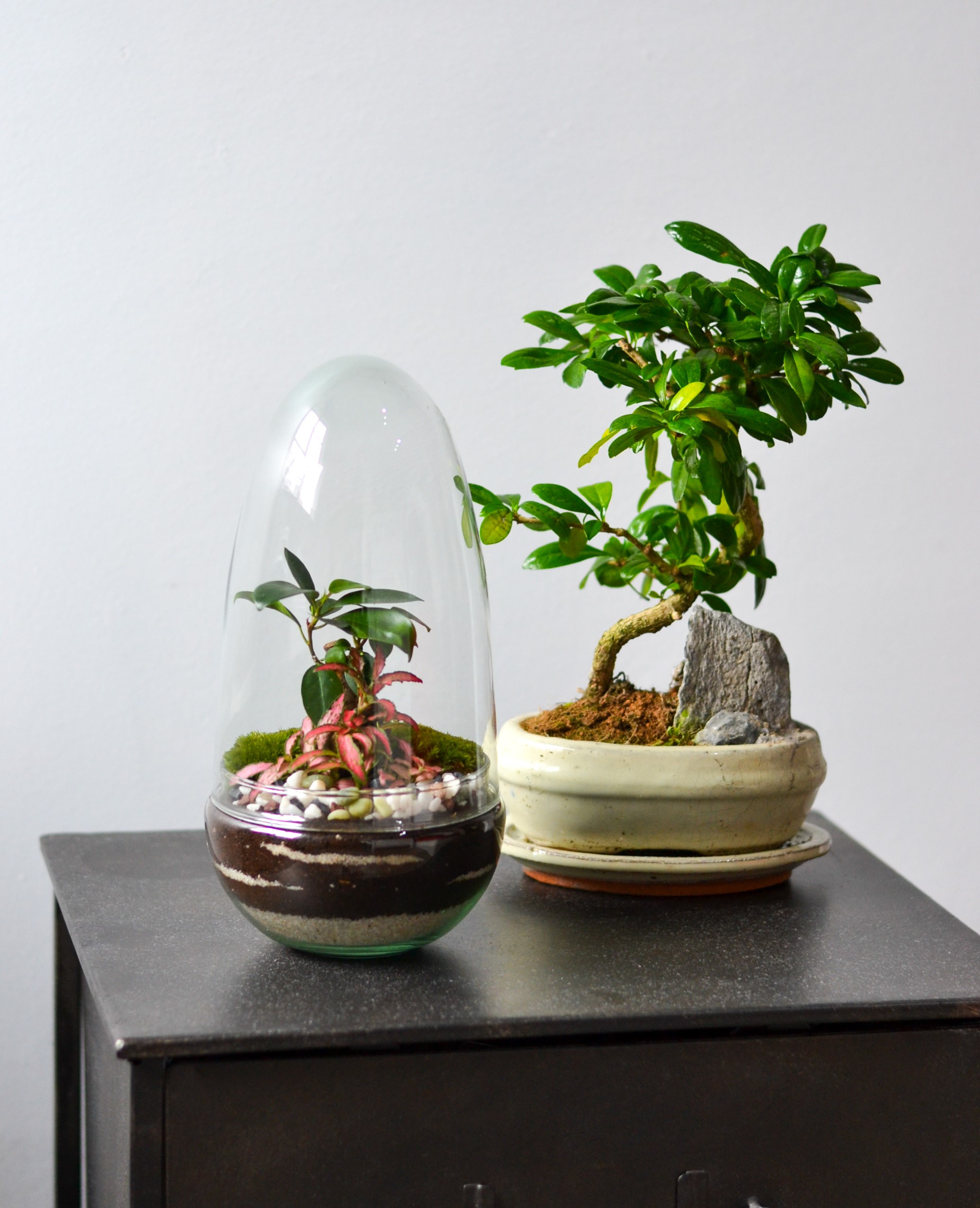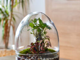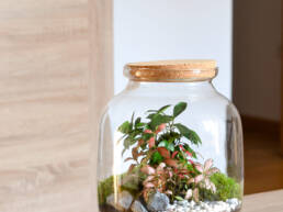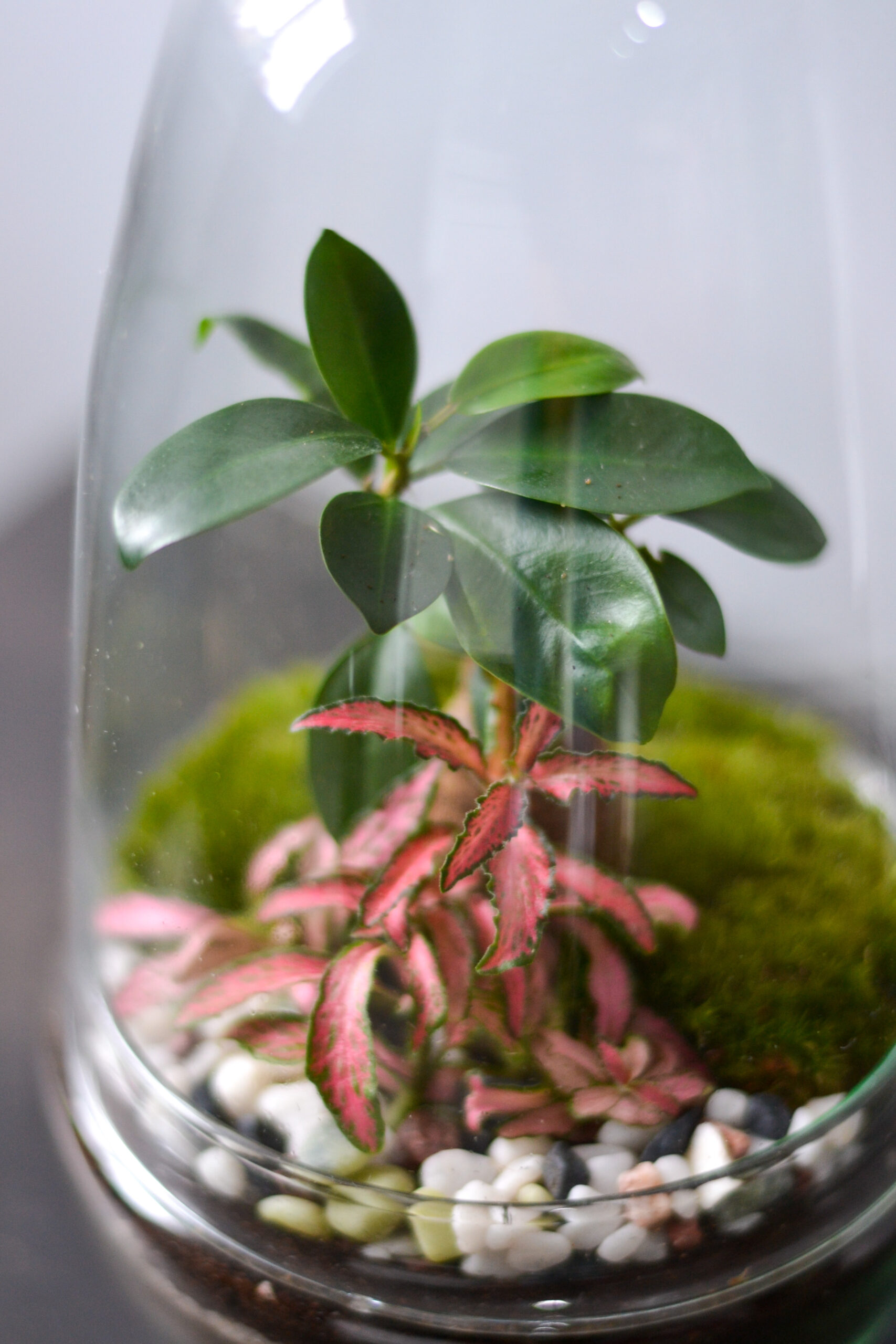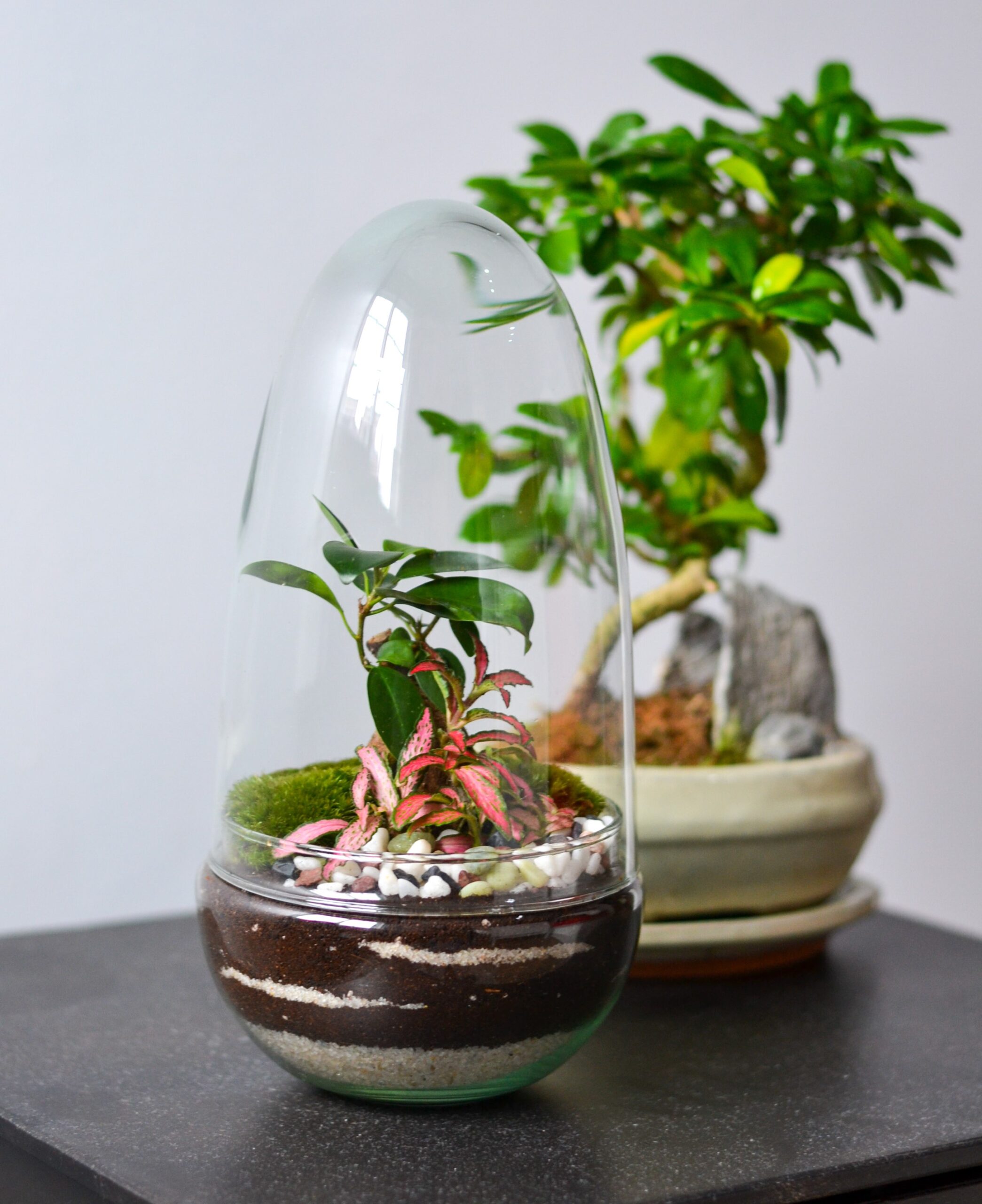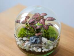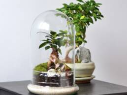 El jardín eterno Tambo está formado por una bonita composición que cuenta con un Ficus ginseng, acompañado de Fittonias en dos colores y musgo bola con grava decorativa. Este modelo dispone de tapa de cristal.